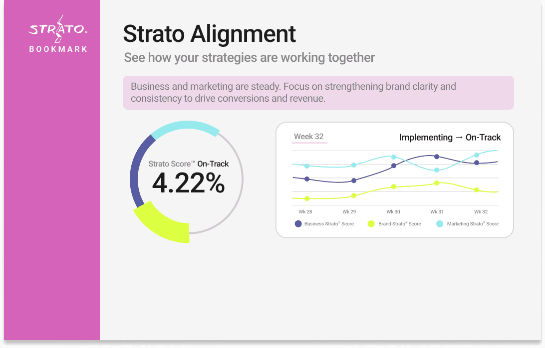 Siloed metrics only show part of the picture. Use the Strato Bookmark™ to see where you stand across your business, brand, and marketing — on one live dashboard. Get an instant performance snapshot and track progress over time to identify what's helping, what's holding you back, and what to adjust to stay on-course.